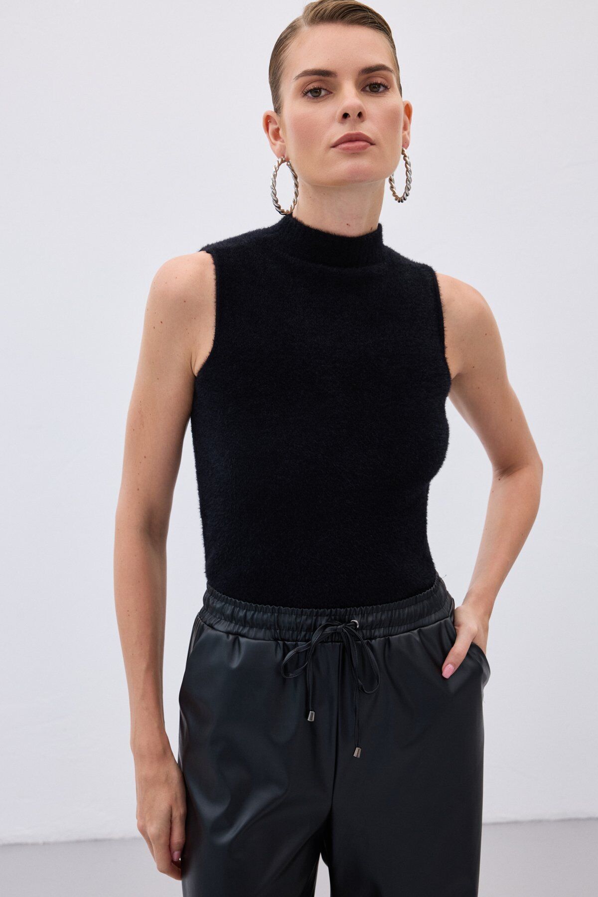 Sıfır Kol Sakallı Triko Bluz - Siyah