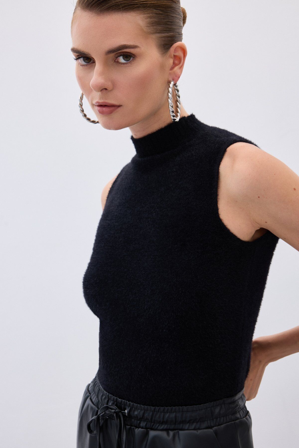 Sıfır Kol Sakallı Triko Bluz Siyah